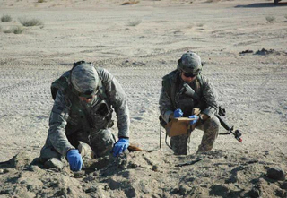 Image: US soldiers examine evidence at an IED training site at the National Training Center at Fort Irwin, California, US.